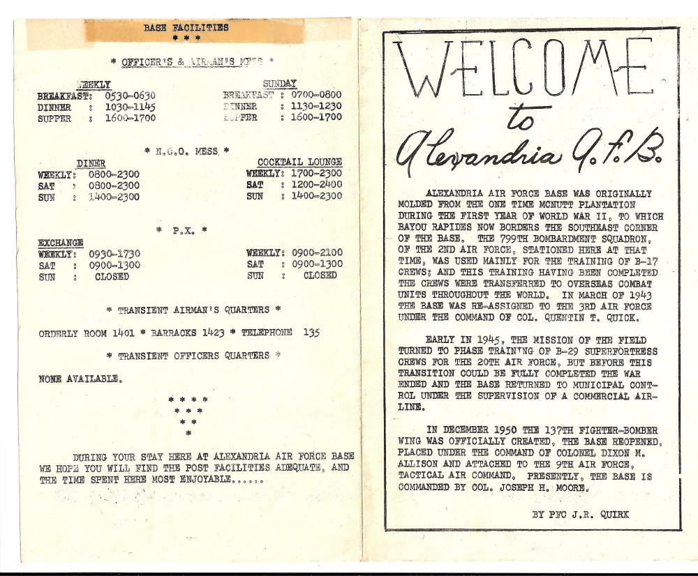 Before my transfer to the U.K. in late 1953, I had spent 32 of my 48 month enlistment at Alex; a stretch, to be sure. As a Missouri lad, I was familiar with summer heat and humidity, but nothing could have prepared me for those Louisiana days & nights! However, my long tenure at Alex gave me the golden opportunity to more than just meet the local folks. I spent Christmas and other holidays in their homes, lived off base with several families, danced with their daughters at the local Community Center, attended Pineville College, and became immersed in their customs and attitudes. To this day, I have a deep affection for Southerners.